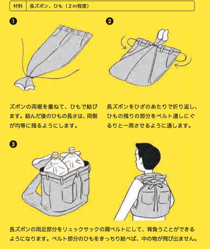 リュックをこよなく愛するアウトドア派にとってみて、「長ズボン」の予備があるのにリュックがない状況ってどんな場面?とまず思ってしまうのですが、それ以上に気になるのが、まさかこの人「長ズボン」を脱いでる?のって事です。まさかね。それはないでしょうから、きっと避難所で「長ズボン」は配布されたけど、カバンはなかったという状況かもしれません。
