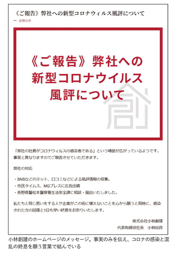 あらぬ風評を立てられることは、会社の存続に関わる大きなリスクだ。生活者と直接商売する業種であればなおさら。創業90 年を超える老舗工務店の小林創建(長野県松本市、小林稔政社長)はこの春、まさにそうした危機に直面した。「社長が新型コロナウイルスに感染した」というデマが突然広まったため。小林稔政社長は「強い焦燥感に駆られた」と振り返る。コロナ不安からのデマ・風評が多数発生しているなか、同社がどのように難局を乗り切ったのか、危機時の広報はどう機能し、どんな効果をもたらしたのかを取材した。