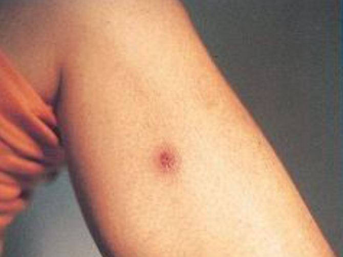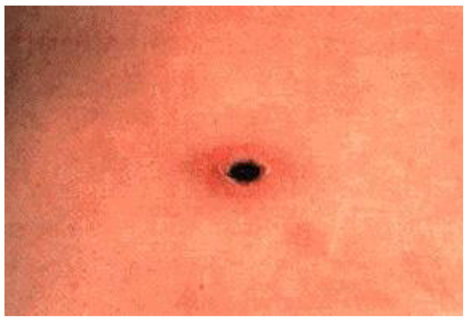 ツツガムシリケッチアを保有する有毒ツツガムシ幼虫に刺された部位の刺し口(図2)と、発熱、発疹(図3)が主な症状ですが、ときに播種性血管内凝固(disseminated intravascular coagulation; DIC)を発症し、重篤化することがあります。DICとは、全身の血管の中で血栓(血の塊)ができやすくなったり、容易に出血したりする疾病のことです。