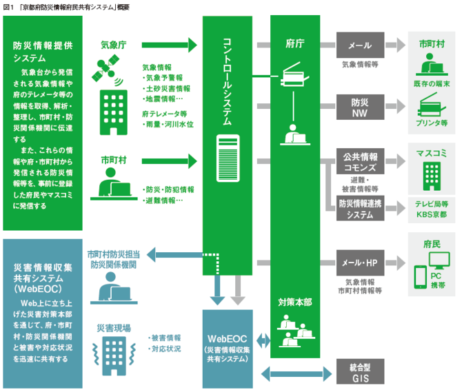 災害の現場状況のほかにも、気象庁からの気象予警報、土砂災害警戒情報、地震情報、総務省消防庁からのJアラート(国民保護情報)、市町村からの避難勧告など必要なデータは上流下流問わずすべて中央のコントロールシステムを通じてWebEOCに集約される。避難勧告や災害情報などは、一般財団法人マルチメディア振興センターが運営する「公共情報コモンズ」(※)を通じて報道機関へも自動的に配信される。さらに登録制のメールシステムを通じて府民にも情報が配信される。