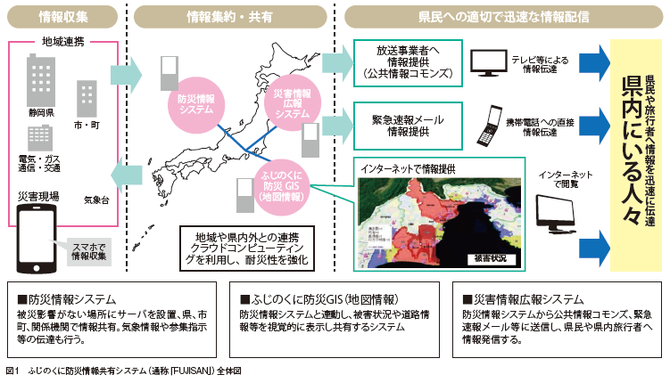静岡県は、1976年の東海地震説発表時から県内全域が被災することを想定し、早くから全国に先駆けた防災情報システムの開発に取り組んできた。しかし、近い将来発生が懸念される南海トラフ巨大地震では、近隣県も含めさらに超広域にわたる被災の可能性が指摘されている。そのため、情報を収集するだけでなく、政府、自衛隊、市町村、消防、警察、医療機関など災害対応に係るすべての人が情報を共有でき、必要に応じて県民にも情報を提供できるクラウド型の情報共有システム「ふじのくに防災情報共有システム(通称:FUJISAN)」を2012年に開発した。