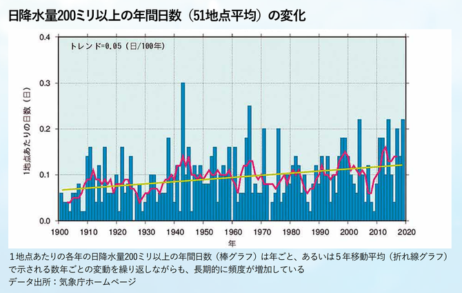 地球温暖化の進行にともなって気温や海面温度が上昇し、大気中の水蒸気量が増えている結果、豪雨の頻度が増し、気象災害のリスクが高まっていることは確率論としていえることです。令和2年7月豪雨は、そうしたリスクが増大しているなかで発生した顕著な現象の一つといえるでしょう。