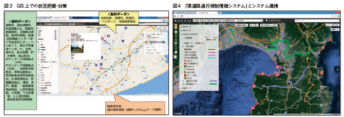 さらに、GISとの連動により、収集した情報が地図上に落とし込まれる。GISではあらかじめ静的データとして、避難所、津波避難ビルなどの避難施設情報のほか、災害拠点病院などの医療関係施設からヘリポートや井戸の場所にいたるまで、約30種類の災害に対応する施設等の情報が入力されており、災害時には同じGIS上に、動的情報として現場の被害報告や開設された避難所のデータがリアルタイムで表示されていく(図3)。30種類の情報は、Web上のチェックボックスで選択して表示することができるので、必要な情報を重ねて表示することも可能だ。県道路通行規制情報提供システムとも連動しており、交通規制がかかっている道路などもGIS上で把握できる(図4)。