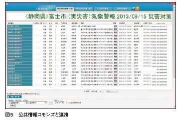 「公共情報コモンズ」への参加により、市町村と合意のとれた避難勧告や避難所の開設情報、対策本部の設置、被害状況などが自動的に報道機関に配信されることになった(図5)。さらに検索ポータルサイトである「Yahoo!Japan」と協定を結び、有事の際には「FUJISAN」から直接情報を配信する仕組みを整えているという。「Google」とも同様の協定を交わしている。そのほか、各携帯会社を通じ緊急速報メールで県民に対し避難勧告・指示などを提供できるようになった。広報資料に関してはインターネットの特設サイトに掲載することができる。