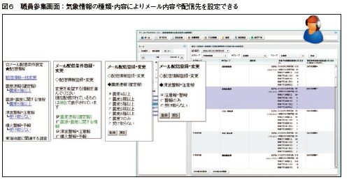 システム運用の流れは、まず気象警報や地震などの災害が発生した場合、画面などにプッシュ型で通知PCがポップアップされる。災害がある一定の水準に達した場合、県職員には一斉に安否確認・一斉参集指示メールが配信される(図6)。
