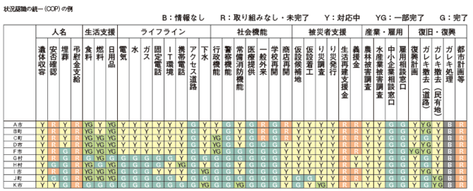 危機が発生すれば、それまでとは別の新しい現実が生まれます。しかし、それがどのような姿をしているかは、発災当初においては誰にも認識されていませんし、その姿が災害対応にあたる関係者の間で統一認識されていなければ、適切な対応がとれません。関係者が連携しながら適切な対応活動をしていくためには状況認識を統一させる必要があります。それをコモン・オペレーショナル・ピクチャー(COP:Common Operational Picture=状況認識統一)※1と呼びます。