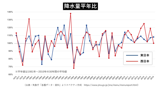 下図は、気象庁のデータベースから作成した1976年から2019年の降水量の平年比を示したグラフです。ここ10年ほどは平年を下回ることがなかったことが見受けられますが、20年前・30年前に比べて劇的に降水量が増えているということはないようです。