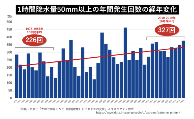 一方、1時間に50ミリ以上の雨(気象庁の基準で「非常に激しい雨」または「猛烈な雨」)の発生回数を見てみるとどうでしょうか。下図も同じく気象庁のデータベースより作成したグラフで、1976年から2019年に1時間当たり50ミリ以上の雨が降った回数を示しています。総体的な降水量は劇的に増えていると言えないものの、短時間にまとまって降る雨の回数は明確に増加していることが見て取れます。