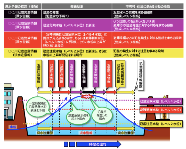 まず簡単に洪水予報についておさらいをしておきましょう。気象庁による洪水予報の概念図が分かりやすいので下に引用しました。洪水予報は河川を特定して発表される水位などの予想で、河川の水位が各基準の水位(「氾濫危険水位」や「避難判断水位」などと呼ばれるもの)に到達しそうな際や実際に到達した際、また、氾濫が発生した際などに発表されます(図上部の表参照)。図の下部分を見ると河川の断面図の中に基準となる水位が示されており、水位の上昇(あるいは下降)に合わせて各種の情報が順次発表されていくことが分かります。