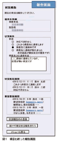 災害が発生した場合にはまず社員の安否を確認した後、自分の担当顧客に状況を確認。連絡が取れたのか、取れなかったのか、応急処置を依頼されているのか、調査を依頼されているのかなど状況を個別にシステム上に入力する。もちろん被害状況などの画像を添付することも可能だ。携帯やスマート端末からも入力できるため、現地から報告することもできる(図1)。