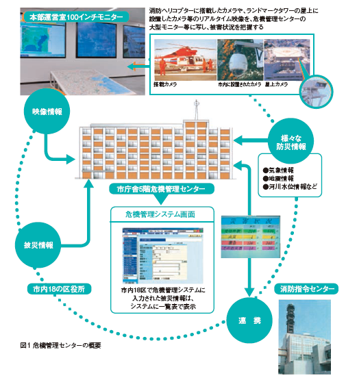 横浜市の危機管理センターには、大規模地震をはじめ様々な危機に迅速・的確に対応できるように、その中心となる本部運営室には100インチのモニターが3台並び、消防ヘリコプターに搭載したカメラや横浜ランドマークタワーの屋上に設置したカメラなどのリアルタイム映像を映し出すことができる仕組みになっている。