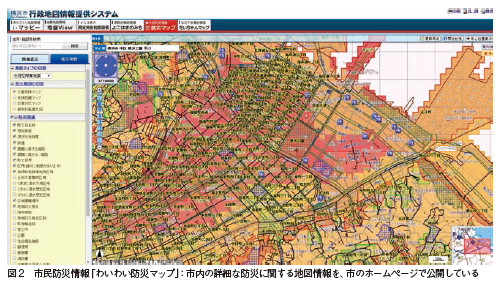 「危機管理とは人であり、訓練であり、意識である」と唱えた上原氏が9年前に横浜にまいた危機管理対応の種は、現在も着実に育って実をつけている。わいわい防災マップ」を開設(図2)。地区レベルで「災害危険マップ」「危険回避マップ」「応急対応マップ」「都市計画基本図」を表示でき、さらに首都直下地震や南海トラフ地震が起きた場合の「想定震度」「液状化危険度」「避難に適さない道路」のほか、「災害用井戸協力の家」「防火水槽」「帰宅困難者一時滞在施設」など30種類以上の災害関連施設情報をGIS上にプロットして見ることができる。情報は横浜市ホームページのトップページから「行政地図情報」のリンクをクリックすると誰でも閲覧することができる。