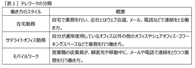 テレワークは、ICT(情報通信技術)を活用することで可能となる、場所や時間にとらわれない柔軟な働き方ですが、そのスタイルによって次の3つに分類することができます[表1]。