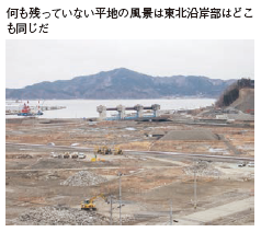 見渡す限り、何もない土地が広がる。東日本大震災で津波により街が消えた景色は、東北の沿岸部のいたるところで目にする。沿岸部では巨大な防潮堤の整備が進み、陸地ではところどころこんもりと土が盛られている。防潮堤を津波が超えてきても2m以下の浸水に抑えるために土地をかさ上げしているのだ。