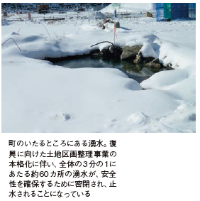 かし、住民全員がこの堤防やかさ上げ工事に賛成しているわけではない。街の中には、いたるところに美しい湧水がある。2月8日に大槌町内で開かれた湧水フォーラムで、参加者からは「土壌がかさ上げされたら湧水が埋まってしまう」と懸念の声が上げられた。大槌には、イトヨという世界的にも珍しい魚が生息する。豊かな自然環境がイトヨの生態を守ってきた。街全体を消し去った津波後も、イトヨの生息は確認されている。町は湧水調査を実施し、湧水がある場所は公園などにして、可能な限り保護していく予定だが、今後の復興工事により、環境の大きな変化を心配する住民は少なくない。堤防により美しい海の景色が見えなくなるとの意見も出た。「これからの子どもたちのために、高い防潮堤を造る必要があるのか、考えるべきだ」と発言者は語気を強めた。