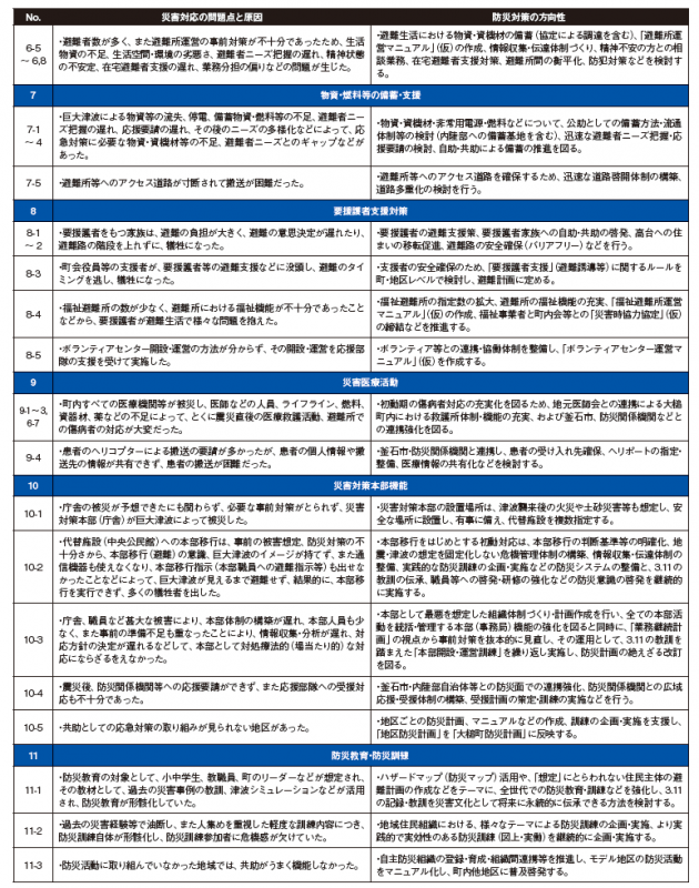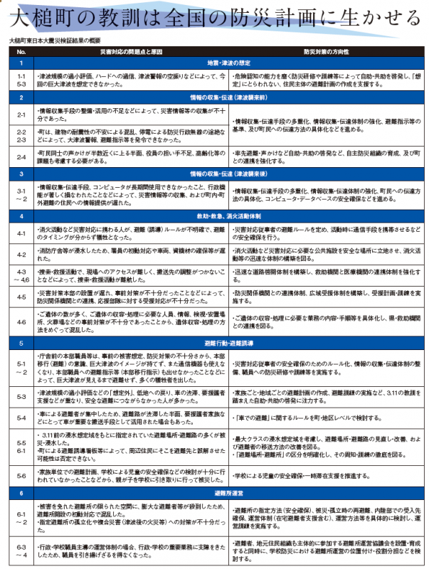 委員長の越野氏は、「役場の立地条件を考えればもっと危機意識を持って準備や訓練しておくべきだったというのが正直な意見。職員の多くが津波はじわじわと下から水が上がってくるイメージを描いていたことがアンケート結果などから分かってきている。中には逃げたくても全体の雰囲気にかき消され、逃げられなかった人もいた。震度5強以上の地震が起きたら全員が高台に避難する、津波被害の危険がない城山の公民館に対策本部を設置するなど具体的なトリガーに応じた行動ルールを決めておくとともに、個人の状況判断能力を磨いておく必要がある。職員は災害対応にあたる義務感から町民を置き去りに自分だけ助かることはできないという正義感を持つ人もいるが、まずは自分の命を守ることが基本」と話している。