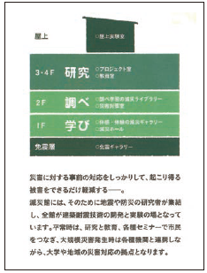 1階には、地方整備局や県、市の災害対策本部が被災した際の、代替拠点としての役割もあり、自治体通信衛星網も整備されている。2階には、キャンパスにいる学生ら2万人を守るための対策本部が設置される。