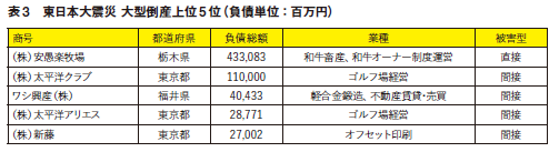 もう1点関氏は、東日本関連倒産で特徴的なこととして、福島の原子力発電所事故に伴う風評被害が大きかったことを挙げる。今回の関連倒産で最も負債総額が多かった倒産は栃木県の安愚楽牧場。その負債総額は4330億円にも上る(表3)。それまでの経営内容も決して健全なものではなかったが、放射能汚染の風評被害が倒産に拍車をかけた格好だ。そのほか、旅館・飲食店などのサービス業で被ばくによる風評被害が発生したのはある程度予想できることだが、実は部品メーカーでさえも「(製造した)部品にセシウムが付着しているのではないか?」という風評が発生し、倒産の一因になったところもあった。