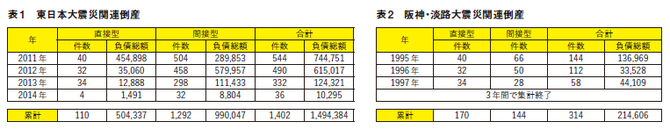 2つの震災による関連倒産の内訳を詳細に比べてみると、まず阪神・淡路大震災の関連倒産は3年間で314件だったのに比べ、東日本大震災関連倒産は4.4倍の1402件に達した(2014年3月7日時点)。また、倒産内容を工場、施設、機械や人的被害を受けたものを「直接型」、取引先の被災などサプライチェーンの分断によるものを「間接型」とすると、阪神・淡路大震災では「直接型」が3年間で170件だったのに対し、東日本大震災では直接型110件、間接型1292件と、間接型が大勢を占めた(表1、2)。関課長は「阪神・淡路大震災で倒産したのは神戸市長田区のケミカルシューズ工場など、局地的な直接倒産が多かった。東日本大震災は、東北に集まっていた部品製造工場が津波被害に遭ったため、大手の自動車メーカーでさえ世界的に生産が滞ることになるなど、取引先・仕入先の被災による販路縮小や製品・原材料資材の不足、受注キャンセルなど日本全国規模でサプライチェーンの分断による関連倒産が起きた(図1)」と2つの震災による倒産状況を分析する。