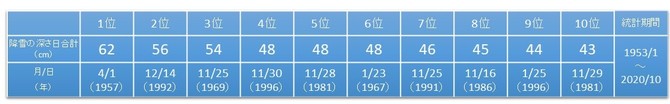 11月は秋と冬の接点で、雪はまだ少ないと思われるだろうか。興味深いデータを表1に示す。これは北海道旭川市における、降雪の深さ日合計(1日に降り積もった雪の深さ)の観測史上1~10位の値と、その発現日である。日降雪量の歴代順位と言い換えることもできる。第1位は、真冬ではなく、早春の4月(1日、1957年)に観測された62センチメートルである。続く第2位は、12月(14日、1992年)に観測された56センチメートル、そして第3位には、11月(25日、1969年)に観測された54センチメートルが食い込む。さらに見ていくと、1~10位のうち、半数以上の6例が11月に記録されているのである。11月は雪が少ない、とは言えないかもしれない。