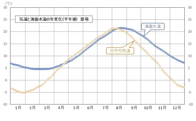 11月に降雪量が多くなることがあるのはなぜか。それは、海面水温に関係がある。図1に、旭川に近い留萌(るもい)における気温と海面水温の年変化を示す。気温は夏至と冬至のそれぞれ約1カ月後に高極・低極となるが、海面水温は気温よりさらに約1カ月遅れて高極・低極となる年変化をしている。これは、海水の比熱が大きい(温まりにくく、冷めにくい)ことに関係している。