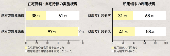 政府がテレワーク推進などを呼び掛けた2月以降、何らかの形で職員の在宅勤務や自宅待機を行った金融機関は全体の約98%。呼び掛け前は4割弱。在宅勤務時に使うパソコンなどの機器に関しては、私用端末の利用を認めている金融機関は全体の4割。この場合、会社が貸与する端末と比較してウイルス対策などの実施割合も低かった。