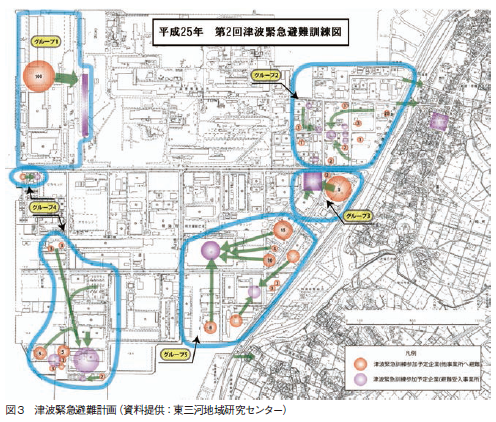 例えばグループ1では海側に立地する企業の従業員は、地震による津波などが発生した場合、隣接する大規模な敷地を有する事業所に逃げ込む。グループ2は中小企業が密集する地域だが、橋が落ちていなければできるだけ内陸の避難所に逃げる。グループ3は団地内の高台(駐車場)に逃げ込む。グループ4は近隣事業所の高いサイロに逃げ込む、グループ5は工場に付帯する体育館に逃げ込む…など、避難グループを形成し、それぞれのグループ内で協議を行って津波緊急避難計画を作成し、訓練を実施することになった。