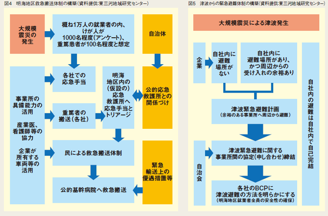 津波緊急避難体制の検討では、2012年3月に発表された南海トラフ地震の被害想定で、明海地区に浸水高40センチ~1mの津波が予想された。調査の結果、明海地区の29事業所(2280人)で、避難空間が不足する事態も明らかになった。一方、受け入れが許容できる事業所は49社。避難空間の不足する事業所から余裕のある事業所への緊急避難を可能とする「企業間協働体制」を構築した(図5)。