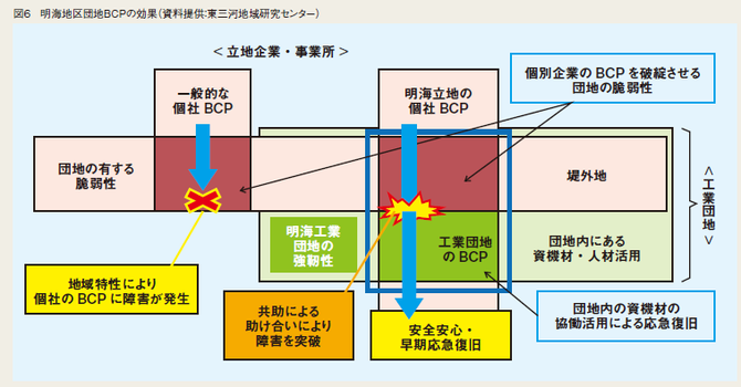 大規模地震などの災害が発生した場合、堤外地と言う特殊な事情がありながらも、前述のような企業間連携によるBCPによって地域産業の強靭化を図るのが明海地区のBCPだ(図6)。「個社のBCPが団地の惰弱性により障害が発生して中断してしまうことがないよう、明海地区は団地の企業連携のBCPで突破し、個社のBCPの支援をしていきたい」(金子氏)。