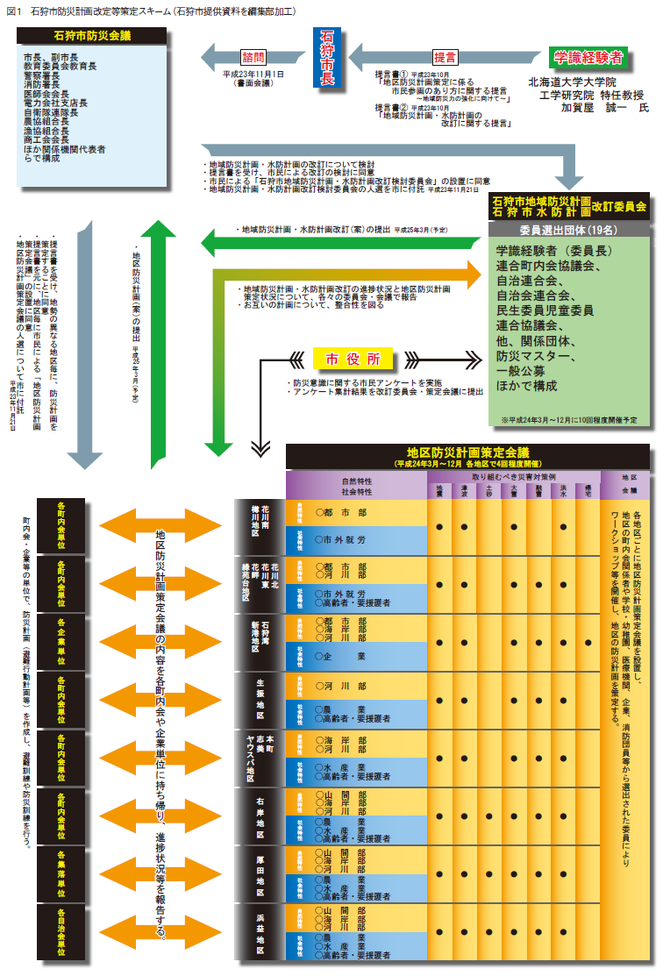しかし、今回の地域防災計画の改定にあたっては、市は防災会議メンバーに加え、学識経験者や石狩市の代表者となる商工会議所関係者、農業・漁業組合関係者などのほか、地区の代表者ら19人で構成される「石狩市地域防災計画改訂委員会(以下、改訂委員会)」を設置した(図1)。改訂委員会に石狩市防災会議から作業を委託するという形をとったのだ。同時に、市民レベルで地区の町内会関係者や学校・幼稚園、医療機関、企業、消防団員らから選出された「地区防災計画策定会議(以下、策定会議)」を設定。策定会議は加賀谷氏の提案で、地域の特性を考慮し8つの地区に分け、それぞれ年に4回のワークショップを開催することになった。