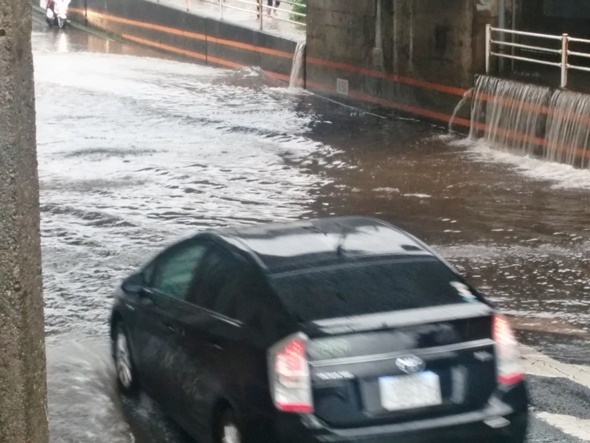 豪雨は降り続く。全身びしょぬれのまま、携帯で消防署(119番)へ連絡した。とっさに保険会社にも連絡しておくべきだと思った。保険会社の担当者はさっそくレッカー車を現地に向かわせる、と答えた。約30 分後に、消防車のサイレンが聞こえた時には、ほっとした。消防士たちは車を「にわか沼」から押し上げて、水没していない路上まで運んでくれた。消防士は「よく車から出られましたね」と語りかけた。