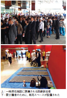 入場者の避難が終了し、場内の被災状況が確認されると、交通機関が停止して帰宅困難となった人々を一時滞在施設に誘導。一次集合場所には、帰れなくなった入場者に見立てたドーム職員が待機しており、誘導担当の職員は蛍光色のジャンパーを着用し、自らが目印となって帰宅困難者を、一時滞在施設が設置されたジオポリスまで誘導した。