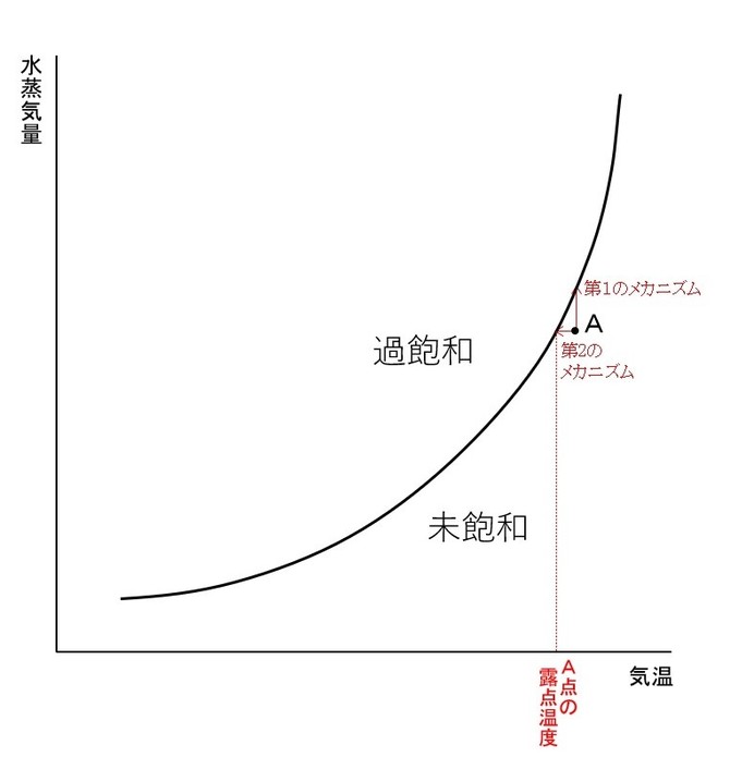 また、図1のA点で示される空気が、水蒸気量を保ったまま気温が下がるとする。すると、A点は図上で左方向にシフトしていき、飽和水蒸気量曲線にぶつかって飽和する。これが、霧発生の第2のメカニズムである。ちなみに、この場合に飽和した温度を「露点温度(または露点)」という。