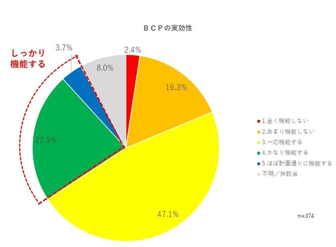 リスク対策.comは、企業などの組織が、BCPにいかに取り組んでいるか傾向を明らかにするために、10月5日~ 10月12日の1週間、リスク対策.comメールマガジン購読者に対してアンケート調査を実施し374 件の有効回答を得ました(総回答数470件)。それによると、BCPを策定済みと回答した組織は61%、策定中は16.8%で、内閣府が隔年で行っている事業継続の取り組みに関する調査とほぼ同じ結果となり、策定組織のうち5 割強が定期的に見直しをしていることが明らかになりました。一方で、BCP の実効性について「有事の際(本社や取引先、従業員が被災するような災害時)どの程度BCP が機能すると思うか」との質問に対しては、「全く機能しない」が2.4%、「あまり機能しない」が16.3%にのぼり、まだ課題が多いことを裏付けました。本調査の結果について解説いたします。