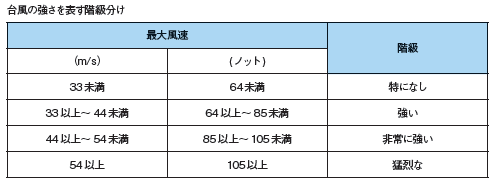 台風とは、赤道付近の暖かい海水が蒸発し、発達した積乱雲の集合体となり、やがて回転運動を始めて強い雨や風を伴って移動する熱帯低気圧のことだ。熱帯低気圧の中心付近では強い風が吹いていて、これが風速17.2mを超えると「台風」に名称が変わる。台風が発達し、風速が44mを超えると「非常に強い台風」、54mを超えると「猛烈な台風」と呼ばれている。