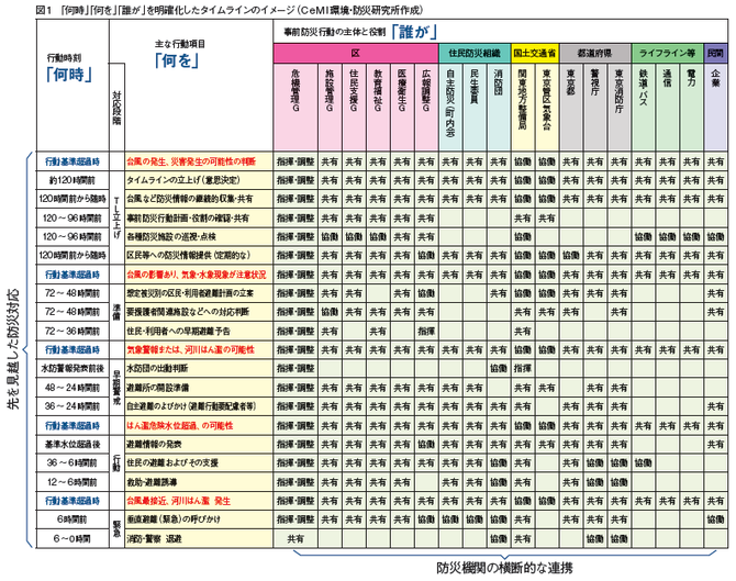 ン」を導入すると発表した。まず国が直接管理する109水系で作成する。タイムラインとは一体どのようなものか。米国で生まれたタイムラインを日本で活用するためには、どのような問題点があるのか。タイムラインの提唱者であるCeMI(環境防災総合政策研究機構)環境・防災研究所副所長の松尾一郎氏に話を聞いた。