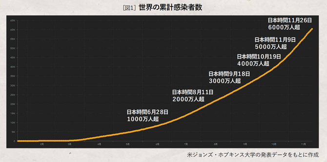 米ジョンズ・ホプキンス大の集計によると、新型コロナウイルスの世界の累計感染者が6000万人を超えた。9日に5000万人に達してから約2週間で1000万人の増加。欧米で感染の再拡大が進み、各国は外出制限や飲食店閉鎖などを強化している。死者は142万人超。