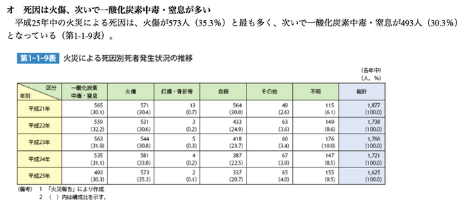 上記の表から、火災による死因別死者発生原因のほとんどは、やけどと室内延焼時に発生する一酸化炭素を吸引したことによる窒息事故であることがわかる。