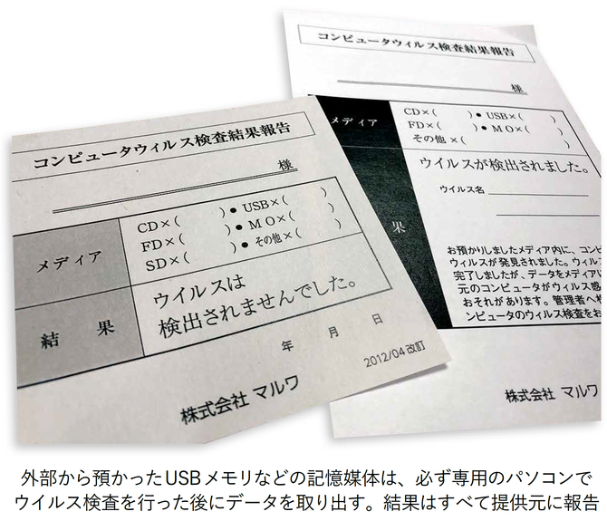 不正アクセスを防ぐため全端末に対策ソフトを導入して常時監視、USBメモリなどの記憶媒体は直接個々のパソコンにつながない。オフィス中央に設置した専用のパソコンでウイルス検査を行い、安全を確かめたのちデータを取り出す。検査結果は全てデータ提供元に報告する決まりだ。