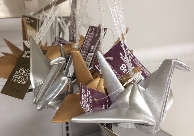 折り鶴のオーナメント!金と銀の折り鶴ですね。色は聖なる雰囲気っぽいです。でも、折っているのではなく、折っている風に3D成形させているところなどが、ニセモノ感をちょっぴり漂わせてくれて、日本では流行らなさそうです(笑)。
