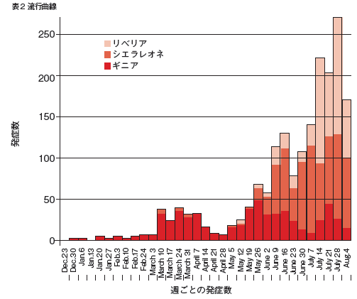 2013年12月にギニアではじまったエボラ感染は、2014年3月まで気づかれずにきてしまった。4月半ば、ギニアのアウトブレイクは一旦終息に向かい始めたように見えるが、5月より隣国のリベリア、シエラレオネに拡大した(表2)。8月16日の段階ではナイジェリアでのケースも含め2240人の累積患者数であったが、4日後には2615人に増えており、感染は拡大している。8月にコンゴ民主共和国でもエボラ出血熱で13人が死亡しているが、これは西アフリカでの流行とは無関係と考えられている。