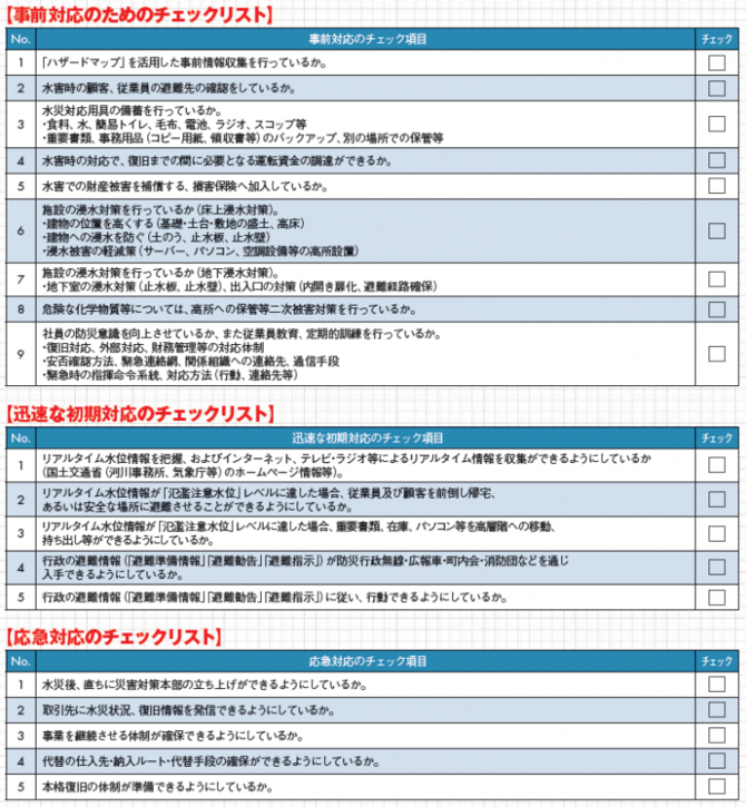 ガイドブックはあくまで洪水対策として策定されたもので、台風や暴風雨まで含めるなら、避難行動の基準を見直す、あるいは、早期退社や出社抑制のルールを定めるなど、いくつか改善する必要はあるが、事前対策、初期対応、応急復旧の各段階における対策を見直す上では参考になる。同ガイドブックに掲載されているチェック項目を紹介する。