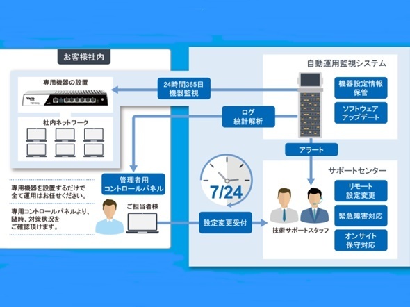 基本サービスとして、UTM(Unified Threat Management:統合脅威管理)機器のレンタル、設置、初期設定、導入サポート、導入後の設定変更、24時間365日体制での運用監視、オンサイト保守を提供する。月額利用料は7万円。
