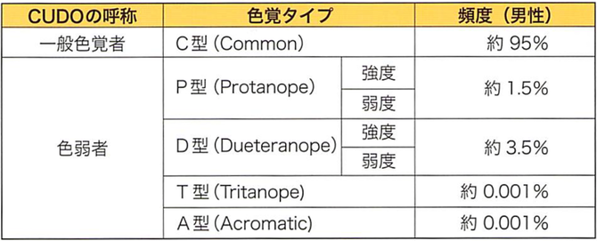 人間の生まれつきの色の感じ方(色覚)は、大きく5つの型(タイプ)に分けることができそれぞれの色覚型には色の感じ方に異なる特徴があります。また色覚は病気や老いによって変わることもあります。