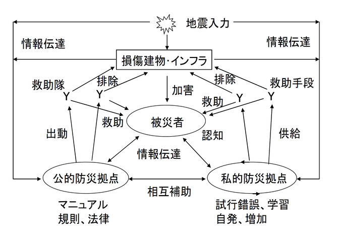 津波による流動的な惨状が広範かつ壊滅的であったため、当初大規模な瓦礫撤去や捜索などに威力を発揮したのは、自衛隊、警察隊、消防隊、建設事業体、さらには米軍原子力空母ロナルド・レーガンなどの機械的かつ組織的な機動力であった。これらは[図4]の公的防災拠点というよりも、外傷がひどく免疫システムを超えた生命体の外側からの外科的処置としてなされたとみるべきであろうか。