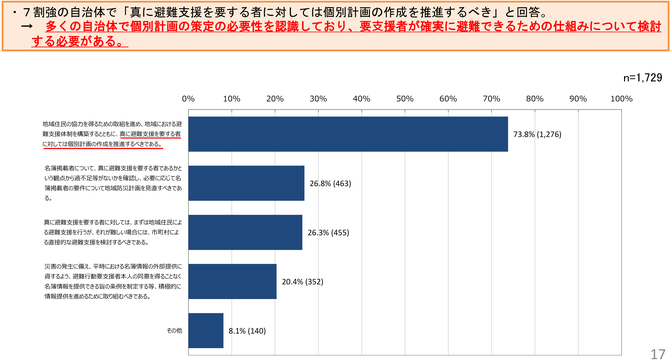 個別計画は、役所内の情報だけで策定できる名簿に比べ、実際に職員が訪問したり、地域住民にも協力してもらう必要があることから、人手も時間もはるかにかかる。市区町村は、もちろん個別計画を策定したほうがよいのはわかっているが、法的位置づけが弱いために優先順位が下がりやすい。