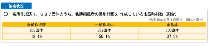 高齢者、障がい者等が個別に災害時の避難計画を作成する「個別計画」の制度が始まったのは2005年。消防庁によると、避難行動要支援者名簿(以下「名簿」)に掲載されている者全員について個別計画の策定を完了している市区町村は12.1%、一部について策定が完了している市区町村は50.1%だ。