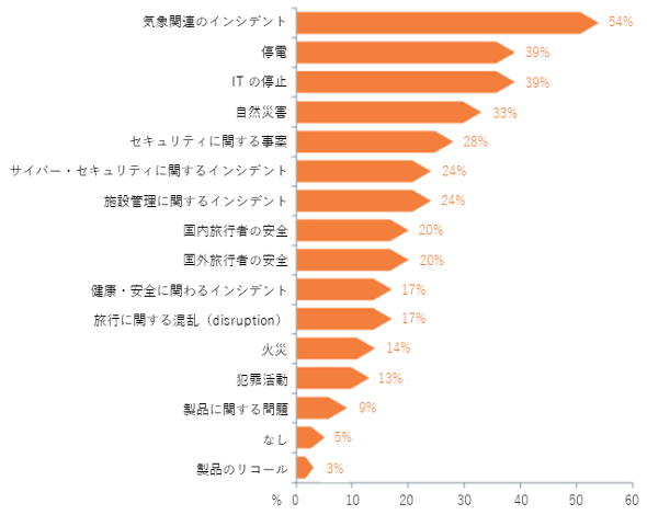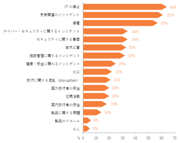 また、図 1 は実際に緊急事態コミュニケーション計画が発動された事象について尋ねた結果であり、気象関連のインシデントが最も多い。これを図 2(実際に組織に悪影響を与えた事象)と比較しながら見ると、実際に発生した事象と緊急事態コミュニケーション計画が発動された事象との間に若干の違いがあることが分かる。