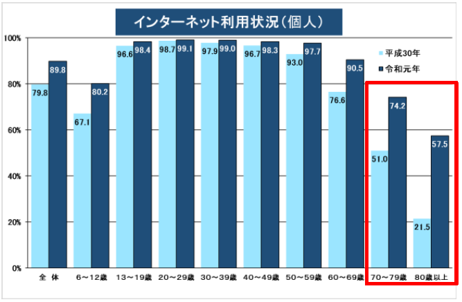総務省が公表した令和2年版情報通信白書によると、2019年個人のインターネット利用率は89.8%に上り、特に70歳以上の利用率が大きく増加しています(※グラフ参照)。