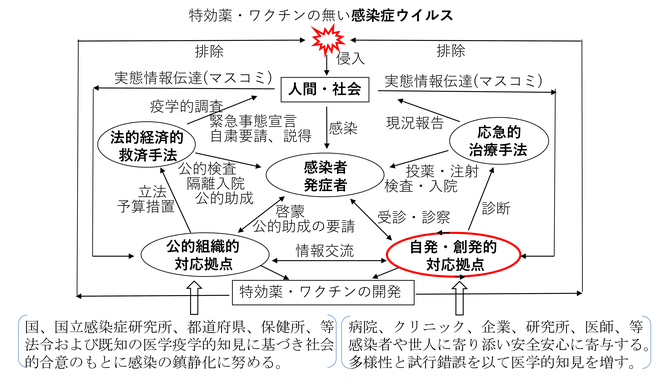 これらは、各国各地の病院、大学、研究所などで治療や研究を通じて得られ、国内外の学会論文報告によって公にされ集約された知見である。すなわち[図8]の右側のボトムアップ型の自発的創発的対応、すなわち獲得学習免疫によるものである。
